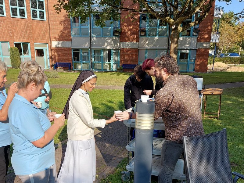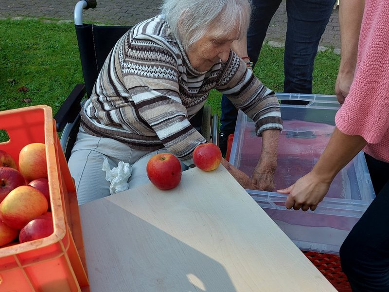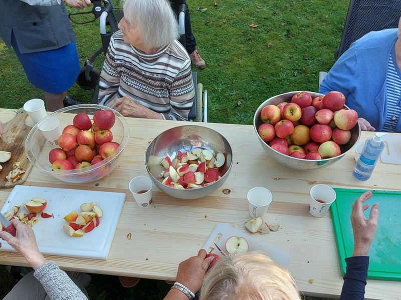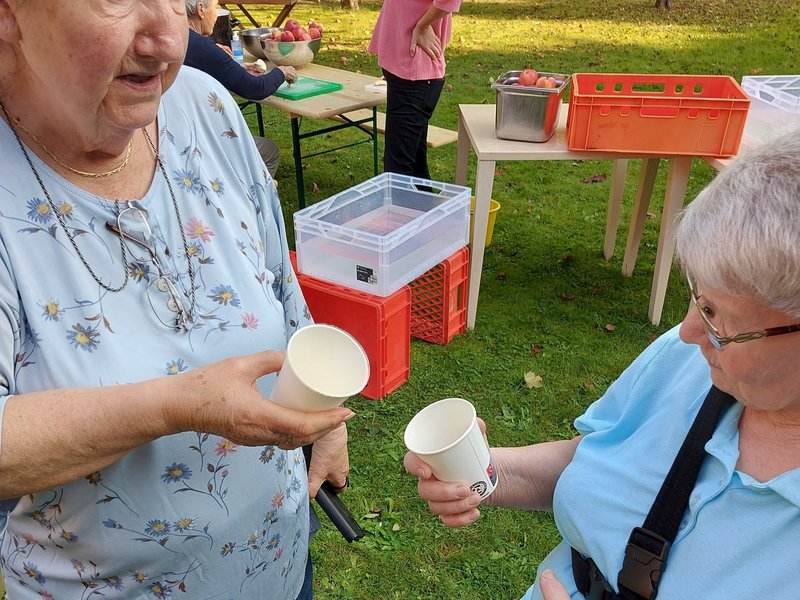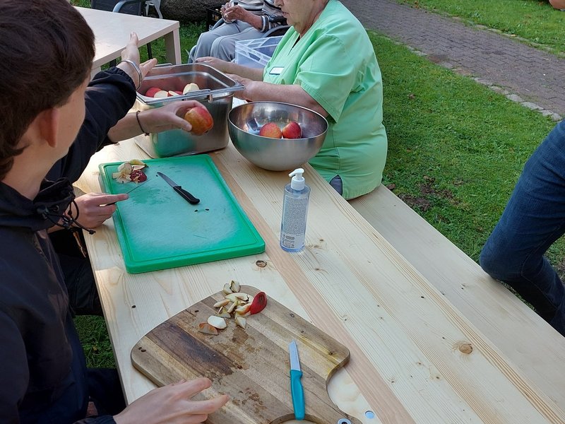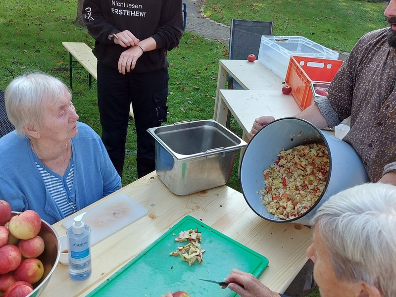 Gleich nach dem gemeinsamen Aufbau kamen unsere Bewohnerinnen und Bewohner an den verschiedenen Stationen zum Einsatz und genossen das wunderbare Wetter, den tollen Teamspirit und natürlich eine Kostprobe des Apfelsaftes. Dann wurden die Stationen auch mal getauscht und wir konnten noch Menschen aus der Nachbarschaft begrüßen, die uns spontan verstärkten. Das Gros des Apfelsaftes kochten wir dann ab, sodass alle unsere Bewohnerinnen und Bewohner unseres Hauses an der Aktion teilhaben konnten.
