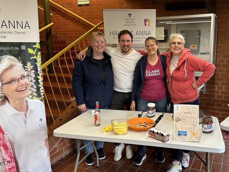 Es schüttete teilweise wie aus Eimern, der Pavillon flog weg, aber wir ließen uns nicht beirren, sondern nahmen die Herausforderung an. So in etwa stellte sich die Lage dar, als wir beim Bahnhofstraßenfest unseren Stand aufbauten, an dem wir Crêpes anbieten wollten. Nach der Überwindung dieser Startschwierigkeiten, die wir durch einen Rückzug in die Räumlichkeiten der Stadtbücherei meistern konnten, erlebten wir einen großen Ansturm, dem wir mit verschiedenen Varianten der leckeren Crêpes begegnen konnten. Ob Apfelmus, Zimt und Zucker oder Nutella, alles fand reißenden Absatz und wir freuten uns über viele nette Gespräche und Begegnungen. Wir haben uns über die Teilnahme sehr gefreut, weil das Miteinander der verschiedenen Institutionen und Gewerke sehr nett und von großer gegenseitiger Hilfsbereitschaft geprägt war. Außerdem danken wir für die Organisation durch das Ehrenamtsbüro der Stadt und die Feuerwehr Raisdorf. Klasse war der Zusammenhalt im Team, der uns auch dem Wetter hat trotzen lassen!