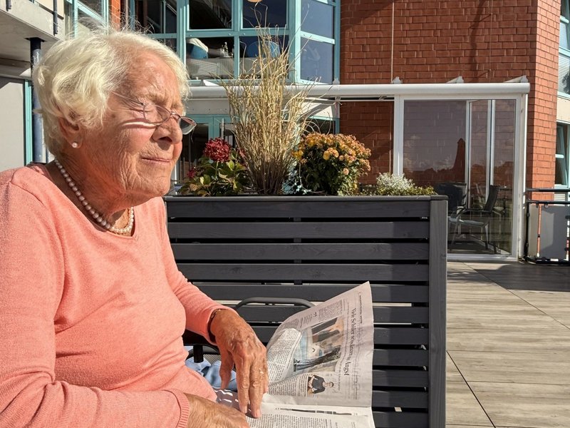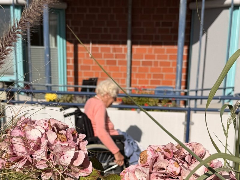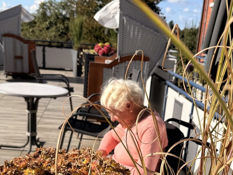 Unser Haus liegt mit der Vorderseite zum St. Annen-Weg, während sich die Rückseite an ein Naturschutzgebiet anschließt. Hier können unsere Bewohnerinnen und Bewohner einen weiten, unverbauten Blick in die Natur genießen - vor allem im Sommer, wenn das satte Grün der Landschaft zum Verweilen einlädt. Dieser malerische Blick ist vor allem von unserer Dachterrasse am schönsten, da sie, großzügig geschnitten, diesen weiten Blick zulässt. In diesem Sommer haben wir die Dachterrasse neu für uns entdeckt - als Ort der Begegnung, der Geselligkeit und für Veranstaltungen. Wir haben noch einige Farbtupfer hinzugefügt, um die Terrasse noch heimeliger und attraktiver zu gestalten: Blumenkästen sorgen für lauschige Ecken, Sonnenschirme spenden angenehmen Schatten und gemütliche Strandkörbe laden zum Wohlfühlen ein. Genießen Sie die neuen Möglichkeiten – wir freuen uns auf Ihren Besuch bei Verwandten und Freunden.