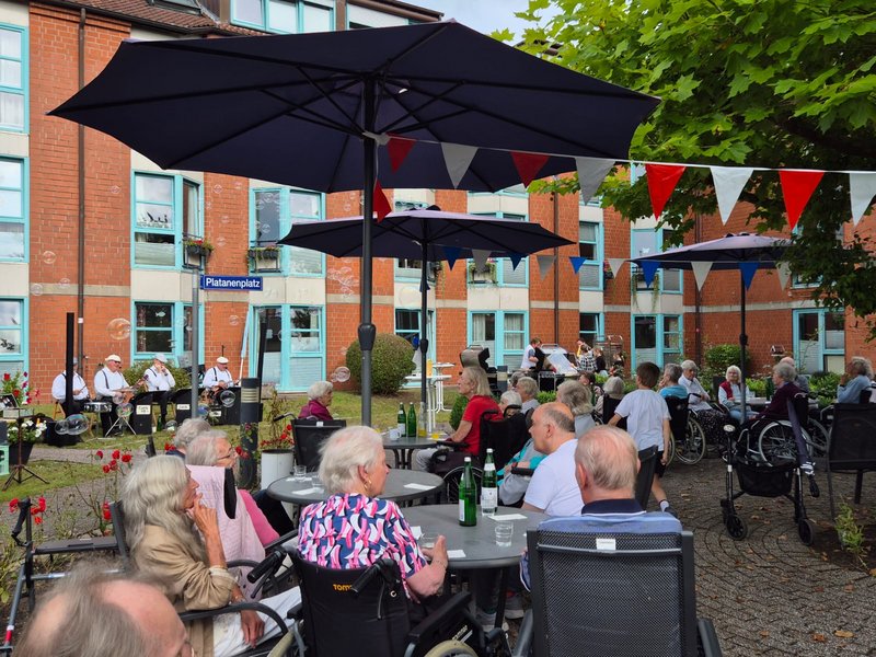 Im Anschluss wohnten wir dann der Eröffnungsshow von Nadine bei, die uns zeigte, wie große Seifenblasen gemacht werden und im Anschluss alle anleitete mal eigene Seifenblasen zu machen, sodass die Bewohnerinnen und Bewohner zum Beispiel bunte Sterne zu Gesicht bekamen. Derweil baute schon die Swing Band „Luck-Up“ auf, die dann zum Beginn des Grillens mit ihrer Musik einsetzte.