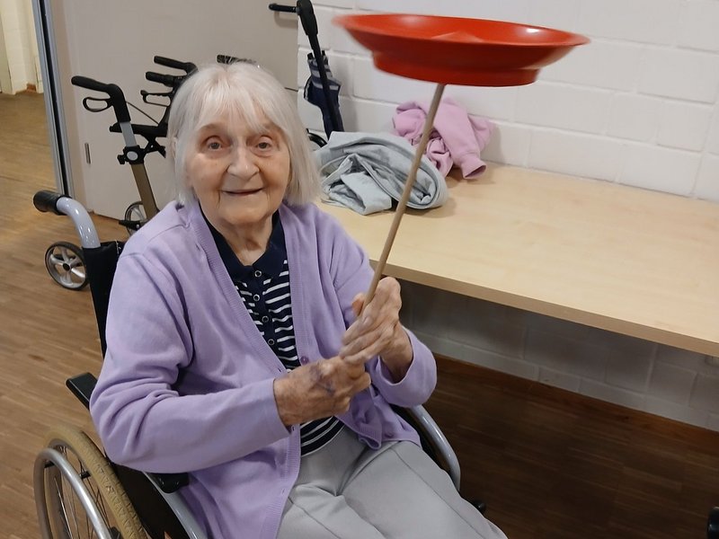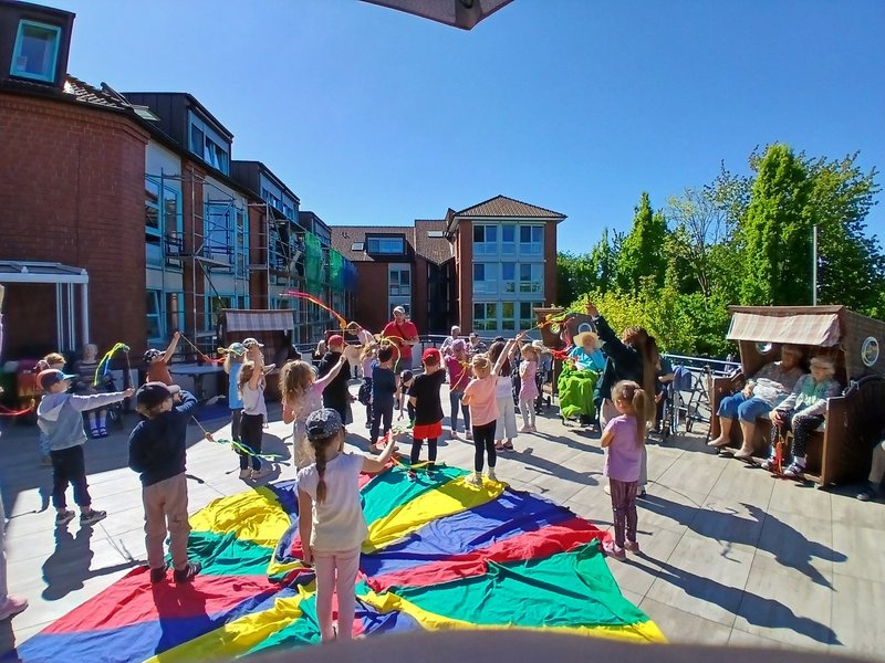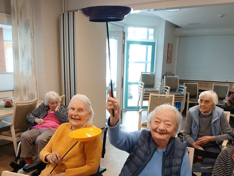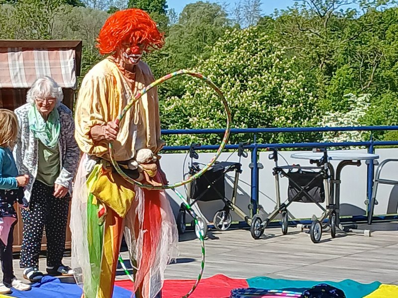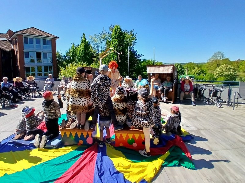 Leuchtende Augen, begeisterte Gesichter und eine Vorstellung der Extraklasse. Diese Kombination durften wir erleben, als uns die Kinder aus der DRK-Kita-Dorfstraße besuchten. Denn sie waren unserer Einladung gefolgt einen Vormittag bei uns im Haus mit einem Mitmach-Zirkus zu verbringen. Hula-Hup, balancieren und sogar eine eingeübte Nummer wurden vom Aktionsbüro „Delectatio“ in Person von Björn Geitmann angeleitet. So erlebten wir auf unserer wunderschönen Dachterrasse einen grandiosen Vormittag mit einer Vorstellung vor dem Mittagessen, die uns alle faszinierte! Dieses Format wurde uns durch die Volksbank-Stiftung ermöglicht, der wir für ihr Engagement unheimlich dankbar sind – was gibt es Schöneres als die Generationen zusammenzubringen und gemeinsam leuchtende Augen zu bekommen?