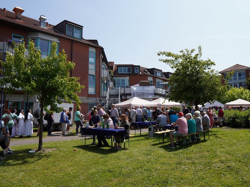 Die Sonne lacht – ein guter Start für unser Sommerfest! Die letzten Vorbereitungen liefen wie am Schnürchen und auch die Frage "Wo sind nochmal die Sonnenhüte?" konnte geklärt werden, so dass wir pünktlich um 11:00 Uhr mit dem Gottesdienst beginnen konnten. Pater Dieter betonte in seiner Predigt das Verbindende eines Sommerfestes, musikalisch begleitet vom Posaunenchor der Kirchengemeinde.
