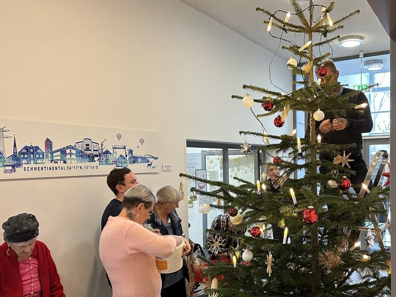 Ob Strohfiguren, weiße oder rote Kugeln, alle Elemente fanden ihren speziellen Platz. Dabei hängten die Bewohnerinnen und Bewohner diese entweder selbst auf oder wir folgten strikt ihren Anweisungen, sodass sich unser Einrichtungsleiter Marco Sievert schnell auf der Leiter wiederfand und auch die oberen Gefilde der Tanne mit dem Schmuck bedachte.